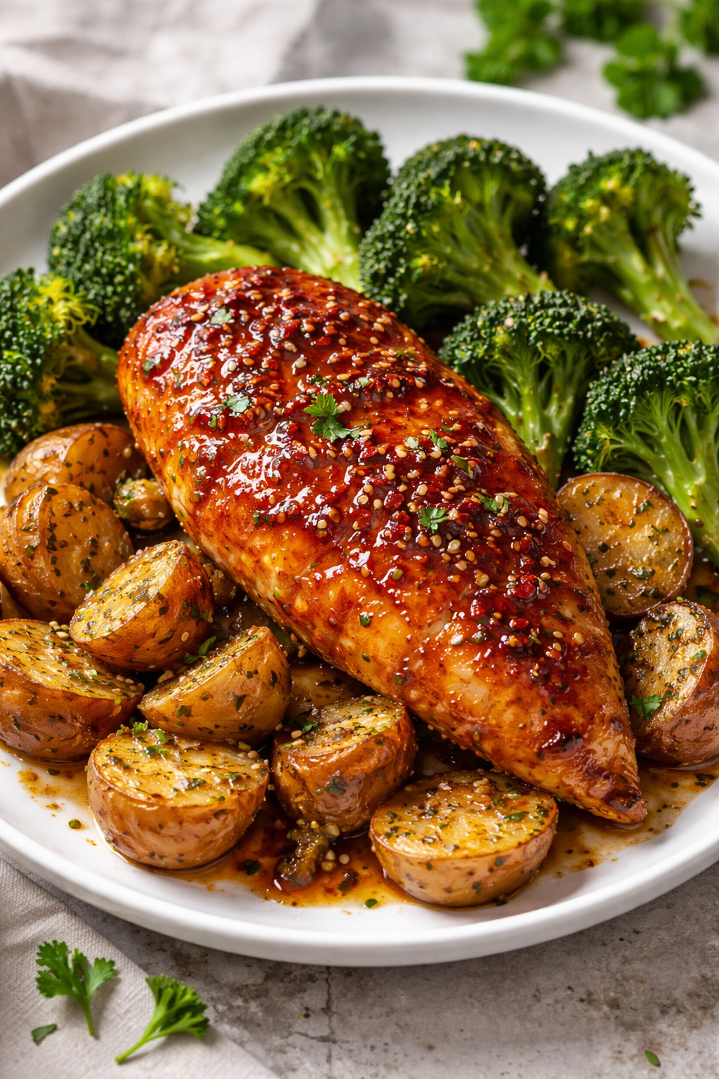Honey Hot Chicken Breast with Potatoes and Broccoli
